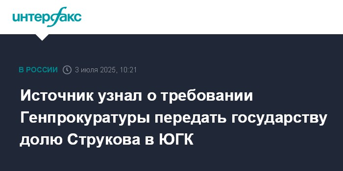 Источник узнал о требовании Генпрокуратуры передать государству долю Струкова в ЮГК