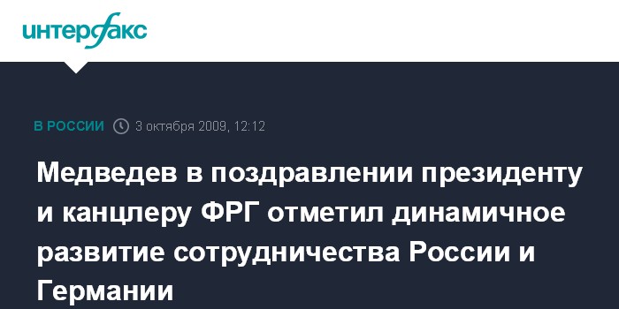 Москва. 3 октября. INTERFAX.RU - Президент России Дмитрий Медведев направил федеральному президенту ФРГ Хорсту Кёлеру и федеральному канцлеру ФРГ Ангеле Меркель поздравительную телеграмму по случаю национального праздника - Дня Германского единства, сообщает в субботу пресс-служба главы государства.