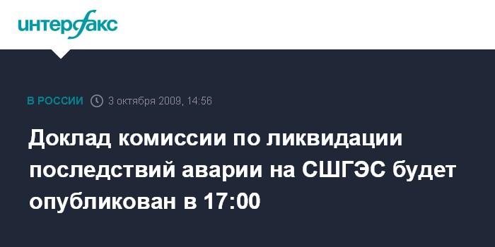 Москва. 3 октября. INTERFAX.RU - Ростехнадзор в 17:00 в субботу обнародует доклад комиссии по ликвидации последствий аварии на Саяно-Шушенской ГЭС.