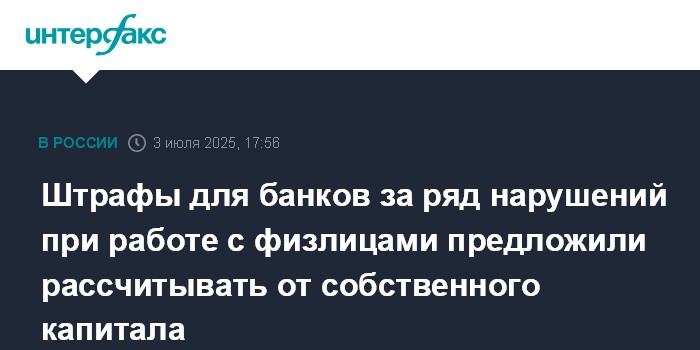 Москва. 3 июля. INTERFAX.RU - Депутаты предлагают взыскивать с банков более жесткие штрафы и установить вилку - до 0,1% и до 1% от собственного капитала (вместо уставного капитала сейчас) за нарушения при привлечении вкладов, выдаче потребительских кредитов и работе с мобилизованными.