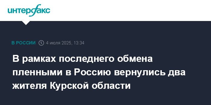 Москва. 4 июля. INTERFAX.RU - В рамках очередного обмена пленными между Россией и Украиной на родину возвращены два жителя Курской области, сообщил источник "Интерфакса" в российской переговорной группе.