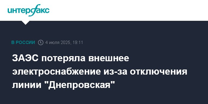Москва. 4 июля. INTERFAX.RU - Внешнее электроснабжение полностью прекращено на Запорожской АЭС, сообщили в пятницу представители станции.