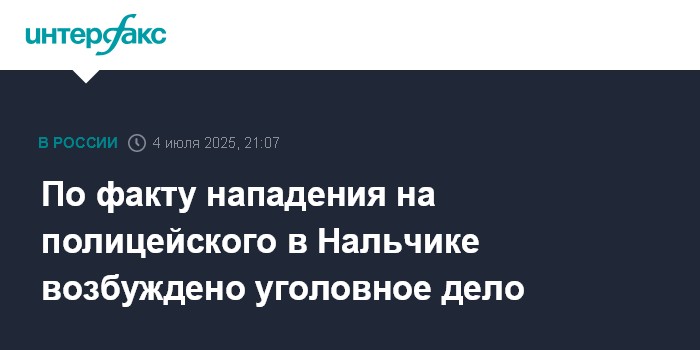 Москва. 4 июля. INTERFAX.RU - По факту нападения на полицейского в Нальчике возбуждено уголовное дело о посягательстве на жизнь сотрудника правоохранительных органов (статья 317 УК), сообщает пресс-служба Управления СКР по Кабардино-Балкарии.