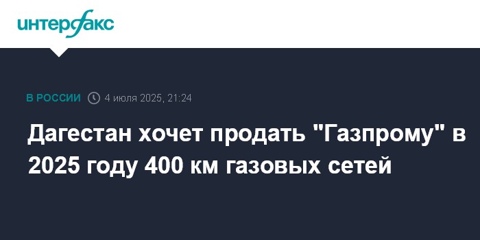 Москва. 4 июля. INTERFAX.RU - Дагестан планирует приватизировать не менее 400 км газовых сетей, сообщил вице-премьер - министр по земельным и имущественным отношениям республики Заур Эминов.