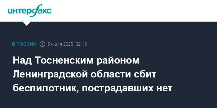Москва. 5 июля. INTERFAX.RU - Губернатор Ленинградской области Александр Дрозденко сообщил, что над Тосненским районом сбит беспилотник.