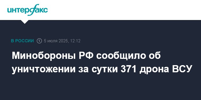 Москва. 5 июля. INTERFAX.RU - Российскими военными за сутки сбит 371 украинский беспилотник, сообщило Минобороны РФ в субботу.