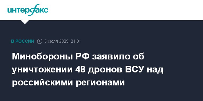 Москва. 5 июля. INTERFAX.RU - Российские военные с 13:50 до 19:00 субботы отразили атаку 48 украинских беспилотников, сообщило Минобороны РФ.