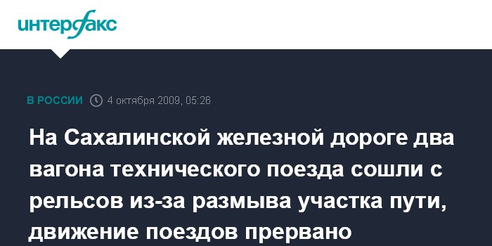 Южно-Сахалинск. 4 октября. ИНТЕРФАКС - ДАЛЬНИЙ ВОСТОК - Движение поездов Сахалинской железной дороги прервано с вечера субботы из-за размыва участка железнодорожного полотна в северной части острова.
