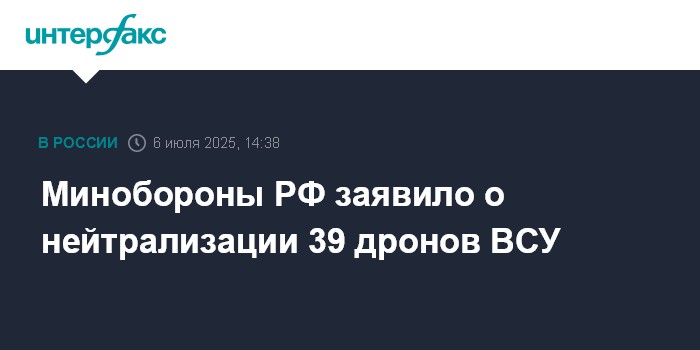 Москва. 6 июля. INTERFAX.RU - Российскими военными с 08:30 до 14:00 в воскресенье отражена атака 39 украинских беспилотников, сообщило Минобороны РФ.