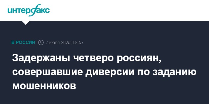 Москва. 7 июля. INTERFAX.RU - ФСБ РФ сообщила о задержании в Челябинской, Ивановской и Тульской областях четырех россиян, которые, действуя по заданию телефонных мошенников, собирали информацию для украинских спецслужб и совершали диверсии.