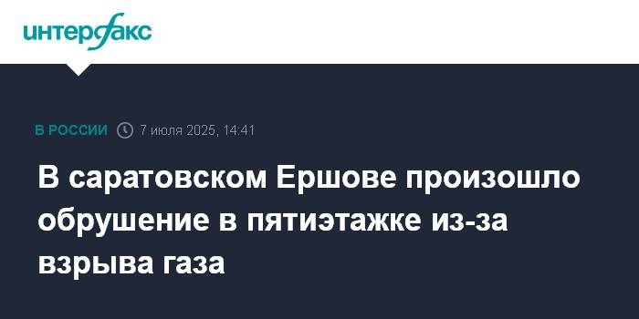 Москва. 7 июля. INTERFAX.RU - Взрыв бытового газа привел к обрушению части многоквартирного дома в городе Ершове Саратовской области, сообщил глава Ершовского района Константин Мызников.