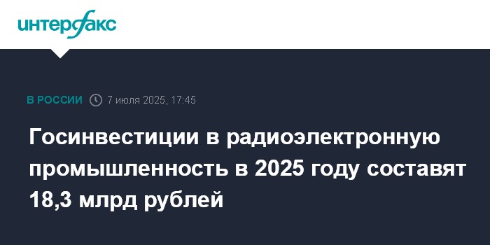 Москва. 7 июля. INTERFAX.RU - Объем инвестиций со стороны государства в развитие российской радиоэлектронной промышленности может составить в 2025 году 18,3 млрд рублей, говорится в материалах Минпромторга к итоговой коллегии ведомства.
