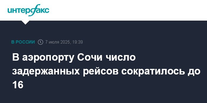 Москва. 7 июля. INTERFAX.RU - В аэропорту Сочи количество задержанных на вылет рейсов к 19:00 понедельника сократилось до 16.