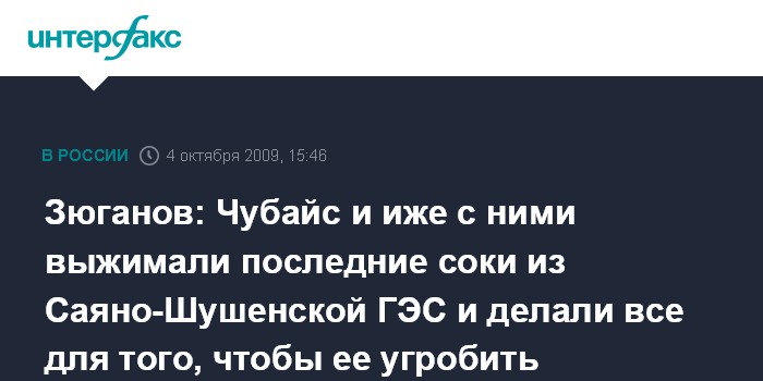 "Чубайс и иже с ними выжимали последние соки из Саяно-Шушенской ГЭС и делали все для того, чтобы ее угробить. Это они не отреагировали на сделанное несколько лет назад главой Счетной палаты Сергеем Степашиным предупреждение о том, что станция находится в предаварийном состоянии и ее оборудование катастрофически сильно изношено", - сказал лидер российских коммунистов.