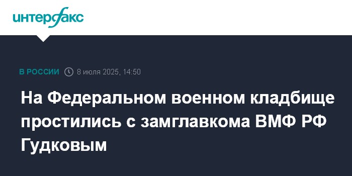 Москва. 8 июля. INTERFAX.RU - Церемония прощания с заместителем главнокомандующего ВМФ России генерал-майором Михаилом Гудковым состоялась на Федеральном военном мемориальном кладбище в подмосковных Мытищах, сообщило Минобороны РФ во вторник.