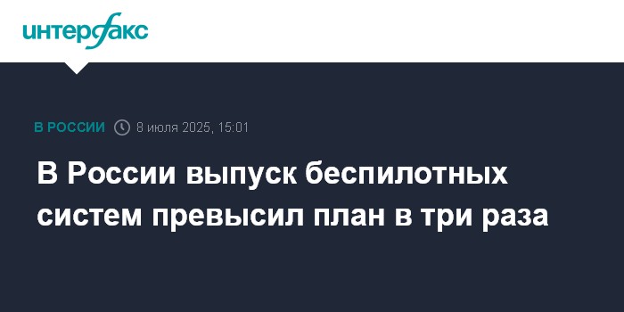 Москва. 8 июля. INTERFAX.RU - В России выпуск беспилотных систем в три раза превысил запланированные объемы, заявил на стратегической сессии "Иннопром-2025" премьер-министр Михаил Мишустин.