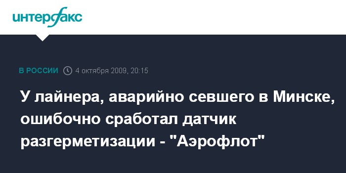 Москва. 4 октября. ИНТЕРФАКС - Причиной аварийной посадки в Минске самолета Аэробус А-320 авиакомпании "Аэрофлот" стало ложное срабатывание датчика разгерметизации, сообщили "Интерфаксу" в воскресенье в авиакомпании.