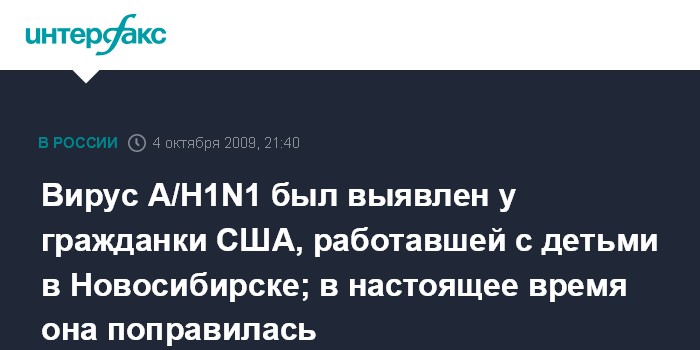 Вирус A/H1N1 был выявлен у гражданки США, работавшей с детьми в Новосибирске; в настоящее время она поправилась