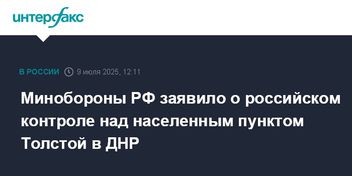 Москва. 9 июля. INTERFAX.RU - Вооруженные силы России взяли под контроль населенный пункт Толстой в ДНР, сообщает министерство обороны РФ.