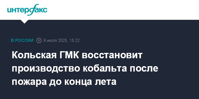 Москва. 9 июля. INTERFAX.RU - АО "Кольская ГМК" (КГМК, "дочка" ГМК "Норникель") намерено летом 2025 года ввести в эксплуатацию новое кобальтовое производство вместо пострадавшего от пожара в 2022 году, сообщил гендиректор КГМК Роман Шаркий корпоративному изданию "KN51".