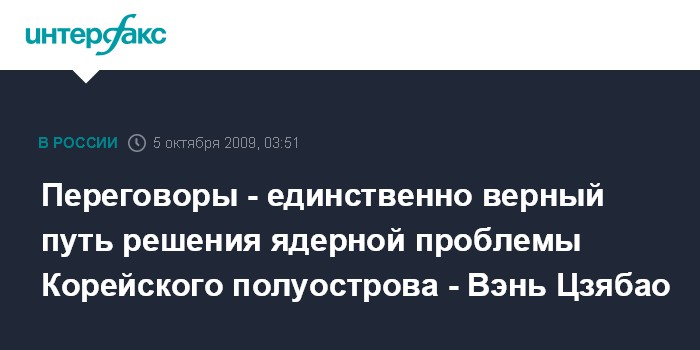 Пекин. 5 октября. ИНТЕРФАКС - Пекин считает переговоры единственным путем решения ядерной проблемы Корейского полуострова, заявил премьер Госсовета КНР Вэнь Цзябао.