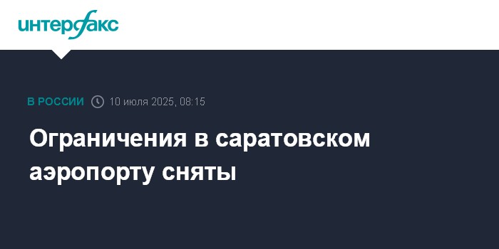 Москва. 10 июля. INTERFAX.RU - В аэропорту Саратова (Гагарин) сняли временные ограничения на прием и выпуск воздушных судов, сообщил представитель Росавиации Артем Кореняко в своем телеграм-канале в четверг.