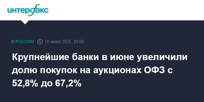 Крупнейшие банки в июне увеличили долю покупок на аукционах ОФЗ с 52,8% до 67,2%