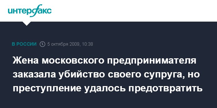 Москва. 5 октября. INTERFAX.RU – Сотрудники Департамента уголовного розыска (ДепУР) МВД РФ предотвратили убийство московского предпринимателя, заказанное его женой, сообщили в пресс-службе ДепУР.