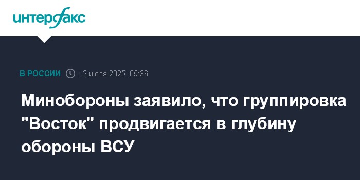 Москва. 12 июля. INTERFAX.RU - Российские военные сообщили, что группировка войск "Восток" продвигается вглубь обороны ВСУ, группировки "Центр" и "Южная" за сутки улучшили положение в зоне специальной военной операции.