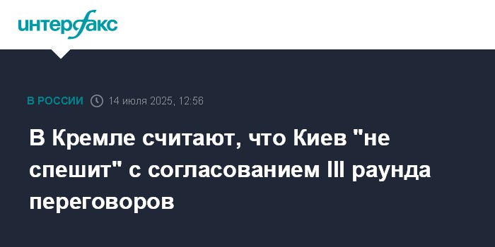"Очевидно, что Киев не спешит. Мы по-прежнему ожидаем предложений по срокам. Российская сторона готова к продолжению и к проведению третьего раунда", - сказал Песков журналистам в понедельник.