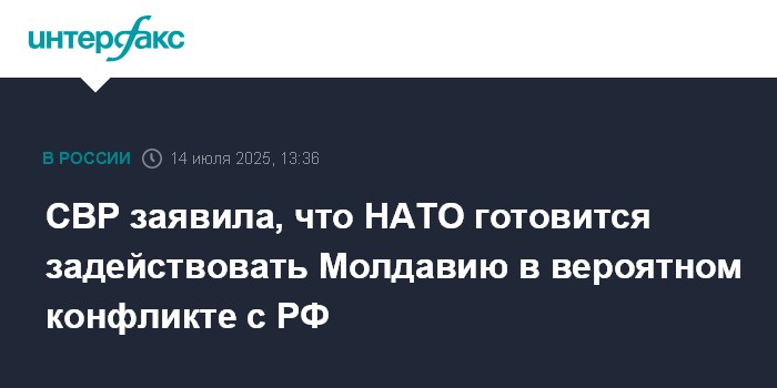 Москва. 14 июля. INTERFAX.RU - По данным Службы внешней разведки (СВР) РФ, НАТО готовится задействовать Молдавию в потенциальном конфликте с Россией, заявили в понедельник в пресс-бюро СВР.