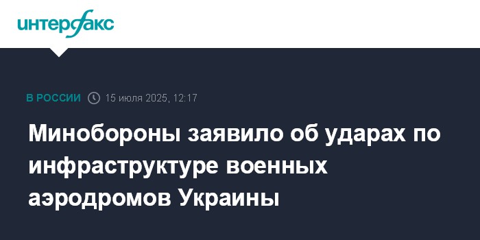 Москва. 15 июля. INTERFAX.RU - Вооруженные силы России в течение суток нанесли удары по аэродромам украинской армии, уничтожены две пусковые установки зенитного ракетного комплекса IRIS-T противника, сообщило министерство обороны РФ во вторник.