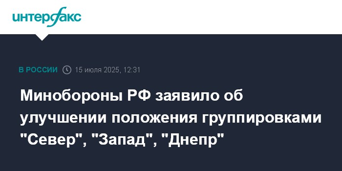 Москва. 15 июля. INTERFAX.RU - Минобороны РФ сообщило во вторник, что группировки "Север", "Запад" и "Днепр" улучшили положение за сутки в зоне спецоперации, группировка "Центр" продолжает продвигаться в глубину обороны украинской армии.