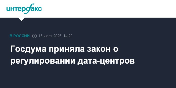 Москва. 15 июля. INTERFAX.RU - Госдума приняла закон, который с 1 марта 2026 года вводит в закон "О связи" официальное определение центра обработки данных, разрешает строить их по концессионным и ГЧП-соглашениям, запрещает размещение в них майнинговой инфраструктуры.