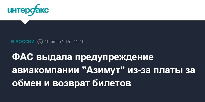 Москва. 16 июля. INTERFAX.RU - Федеральная антимонопольная служба (ФАС) России выдала предупреждение авиакомпании "Азимут" за то, что она необоснованно установила разный размер сбора с пассажиров за обмен и возврат билетов.