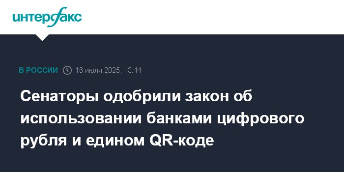 Москва. 16 июля. INTERFAX.RU - Совет Федерации одобрил закон, который водит с 1 сентября 2026 года поэтапное подключение банков и продавцов к платформе цифрового рубля, также с 1 сентября 2026 г. вводится использование ими универсального платежного QR-кода.