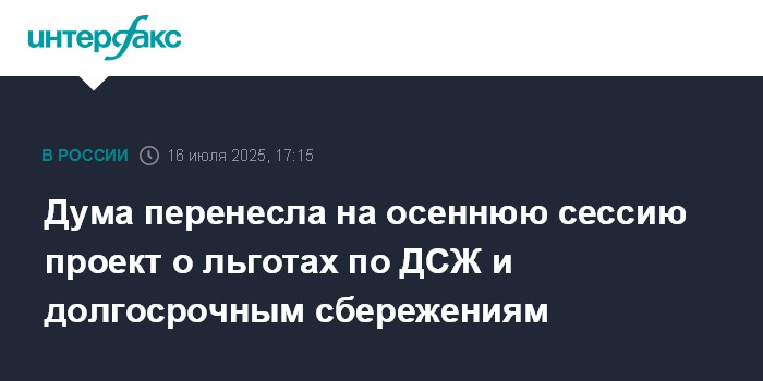 Москва. 16 июля. INTERFAX.RU - Госдума на заседании в среду приняла решение перенести на рассмотрение в рамках осенней сессии законопроект о льготах по налогообложению договоров долгосрочных сбережений и программ долгосрочного страхования жизни (ДСЖ), следует из карточки законопроекта.