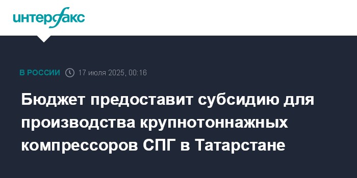 Москва. 17 июля. INTERFAX.RU - Правительство РФ предоставит Татарстану субсидию для финансирования создания производства крупнотоннажных компрессоров сжиженного природного газа.