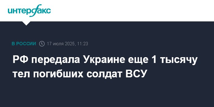 Москва. 17 июля. INTERFAX.RU - Во исполнение Стамбульских договоренностей Украине в четверг переданы еще одна тысяча тел солдат ВСУ, Россия получила 19 тел погибших бойцов, сообщил помощник президента РФ Владимир Мединский.