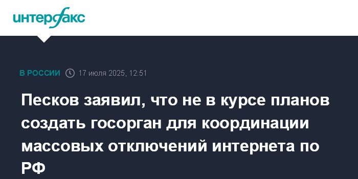 Москва. 17 июля. INTERFAX.RU - Пресс-секретарь президента РФ Дмитрий Песков заявил, что ему неизвестно о планах создания некоего единого госоргана, который будет координировать массовые отключения интернета в российских регионах.