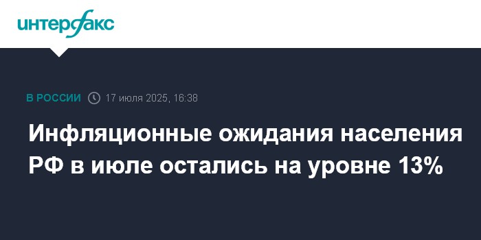 Москва. 17 июля. INTERFAX.RU - Инфляционные ожидания населения РФ в июле остались на уровне 13,0% после снижения на 0,4 п.п. в июне, следует из краткого опроса "инФОМ", проведенного по заказу Банка России.