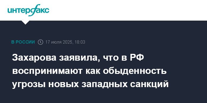 Москва. 17 июля. INTERFAX.RU - В Москве воспринимают как обыденность угрозы введения новых санкций со стороны Запада, заявила официальный представитель МИД РФ Мария Захарова.