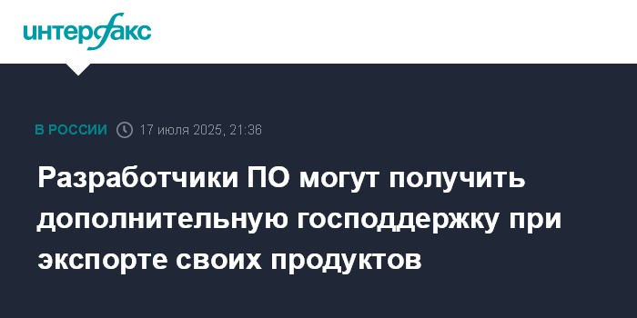 Москва. 17 июля. INTERFAX.RU -Российские разработчики программного обеспечения могут получить дополнительные меры господдержки при экспорте своих продуктов. Проработка этого вопроса предусмотрена перечнем поручений, утвержденных президентом Владимиром Путиным после майской встречи с представителями деловых кругов.