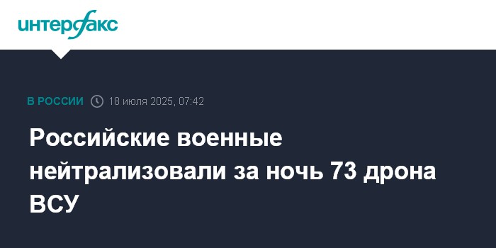 "В течение прошедшей ночи в период с 23:00 по Москве 17 июля до 7:00 по Москве 18 июля дежурными средствами ПВО перехвачены и уничтожены 73 украинских беспилотных летательных аппаратов самолетного типа", - говорится в сообщении.