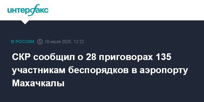 Москва. 18 июля. INTERFAX.RU - Суды вынесли 28 приговоров 135 фигурантам уголовных дел о массовых беспорядках в аэропорту Махачкалы 29 октября 2023 года, сообщает Следственный комитет.