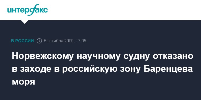 Осло. 5 октября. INTERFAX.RU - Норвежскому научно- исследовательскому судну "Юхан Хьорт" отказано в заходе в российскую зону Баренцева моря.