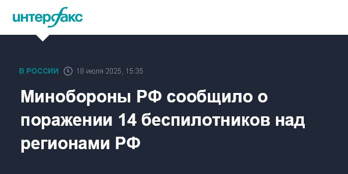 Москва. 18 июля. INTERFAX.RU - Российские военные сообщили, что в пятницу днем нейтрализовали 14 украинских беспилотников самолетного типа.