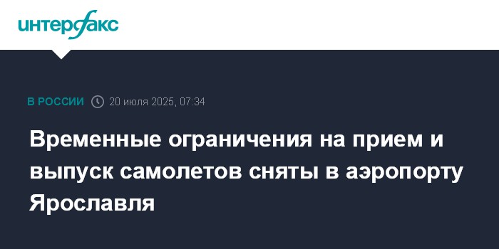 Москва. 20 июля. INTERFAX.RU - Ограничения на прием и выпуск воздушных судов сняты в ярославском аэропорту Туношна, сообщили в Росавиации утром в воскресенье.