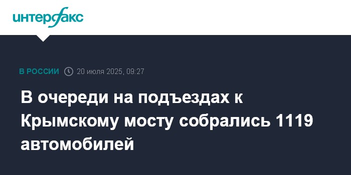 Москва. 20 июля. INTERFAX.RU - Проезда через досмотровые пункты на Крымском мосту в воскресенье утром ожидают 1119 автомобилей, сообщили в инфоцентре, освещающем ситуацию на автомобильных подходах к мосту.