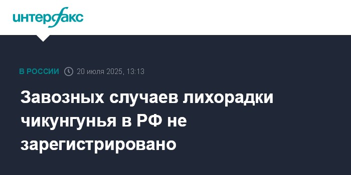 Москва. 20 июля. INTERFAX.RU - Роспотребнадзор держит на контроле информацию о вспышке лихорадки чикунгунья в Китае, завозных случаев в РФ не зарегистрировано.